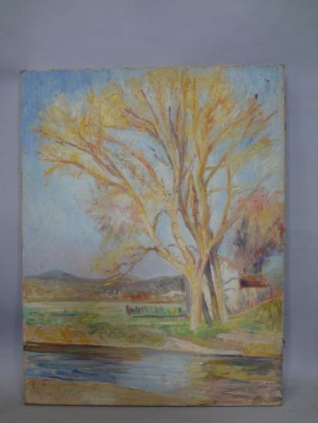 Maison et bouquet d'arbres près de la marre
