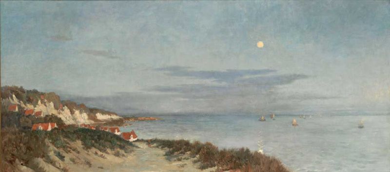 Küstenlandschaft in Flandern an einem Vollmondabend mit auslaufenden Fischerbooten