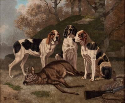 Drei Jagdhunde mit ihrer Beute
