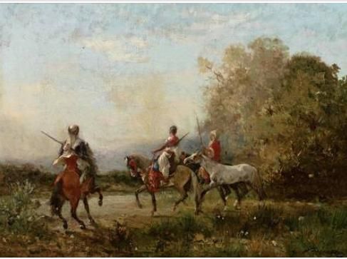 | Paar Gemälde mit orientalischen Reiterszenen. Zum einen: drei bewaffnete Reiter mit Pferden auf Erkundung. Zum anderen: Pferdehe | |