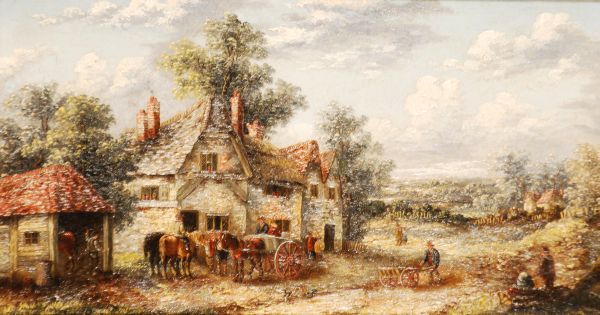 Figures and horses outside a cottage