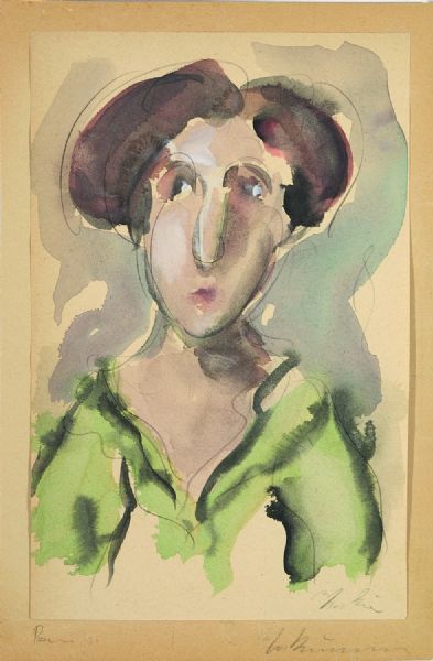 | Porträt einer Frau mit grüner dekolletierter Bluse und nach rechts oben blickenden, fragenden (nachdenklichen) Augen. 1931 | |