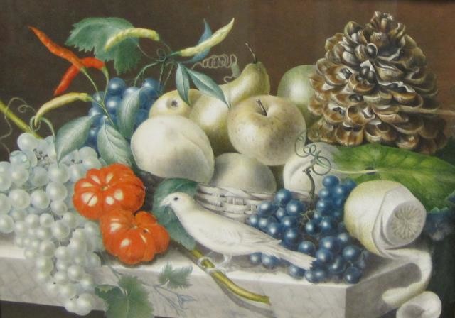 Still Lifes with assorted fruit and canary on marble ledges