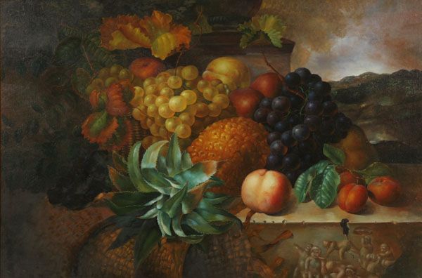 still life with fruit on a stone ledge