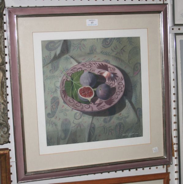 Still Life Study of Figs in a Lustre Dish resting on a Paisley Tablecloth