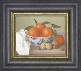 Clementines with leaves; Lemons; Apples in an Imari bowl; and Red currants in a paper bag
