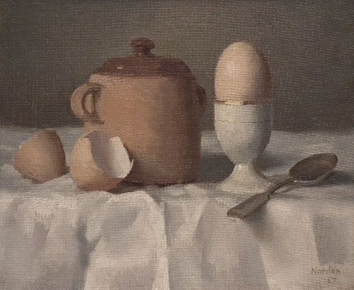 Still life with egg, spoon, bowl and cover