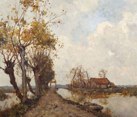 Landschap met wilgen en boerderij aan een vaart