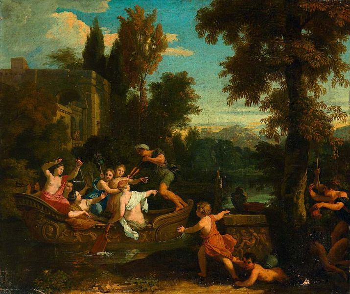 | Eine Schar Nymphen lässt sich vor arkadischer Landschaft in einer prunkvollen Gondel zu Klängen der Triangel übersetzen | |