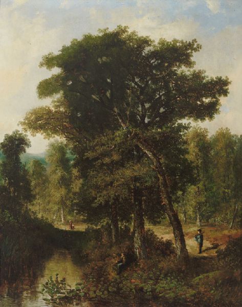 Waldlandschaft mit Figurenstaffage an einem Sommerabend.