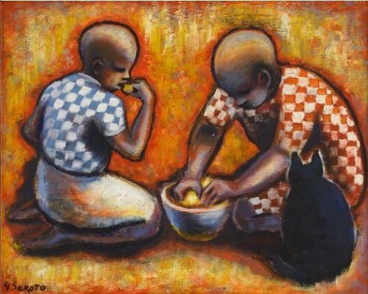 TWO BOYS IN CHECK SHIRTS WITH A BLACK CAT