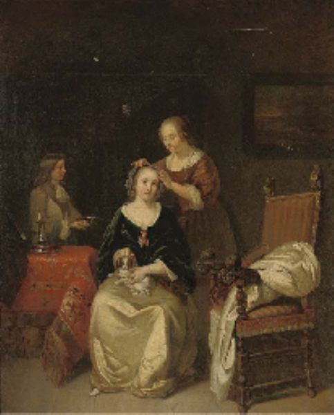 | An elegant lady seated at her table with a dog on her lap, a maid tying ribbons in her hair | |