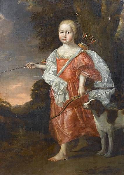 | Portrait of a young girl, standing full-length, dressed as Diana the Huntress, a dog at | |