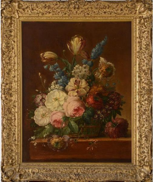 A BASKET OF MIXED FLOWERS UPON A LEDGE
