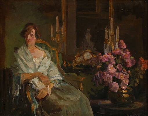 A woman sitting in a lush interior