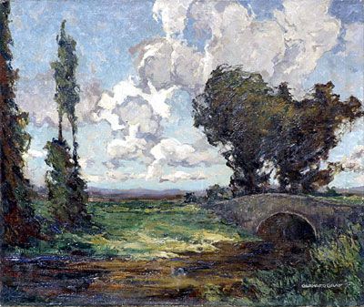Brücke über Bachlauf in weiter Sommerlandschaft.