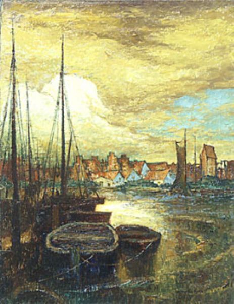 Fischerdorf mit ankernden Booten in der Dämmerung