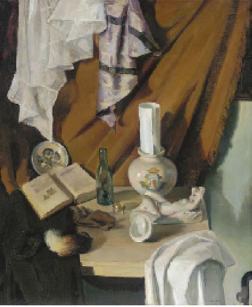 | A pot, bottle, glove, book, and plate on a table, with drapes beyond | |