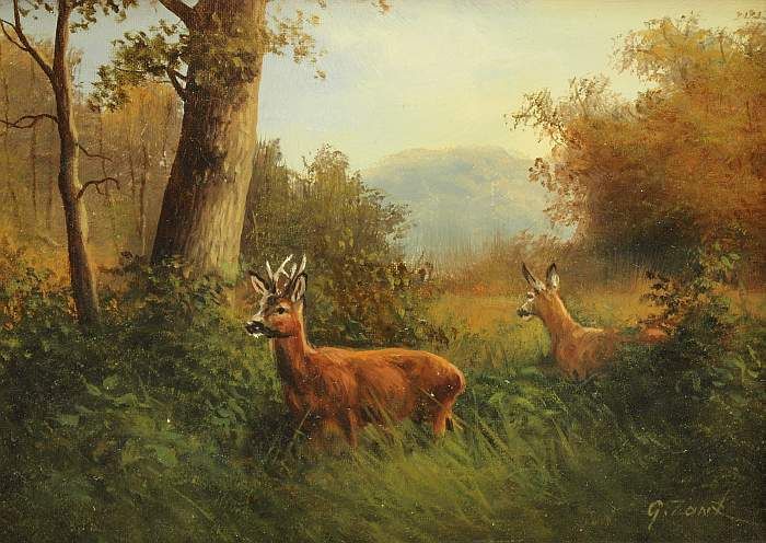 | Rehe im Wald. Darstellung einer sommerlichen Waldlandschaft, im Vordergrund sind ein Rehkitz, ein Hirsch und eine Rehkuh | |