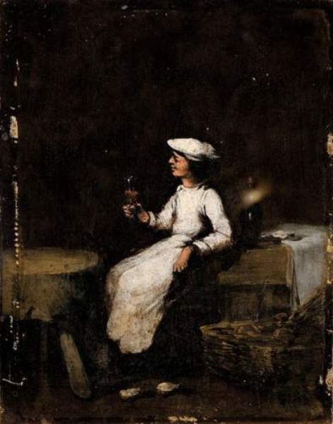 Le jeune marmiton dégustant un verre de vin et des huîtres