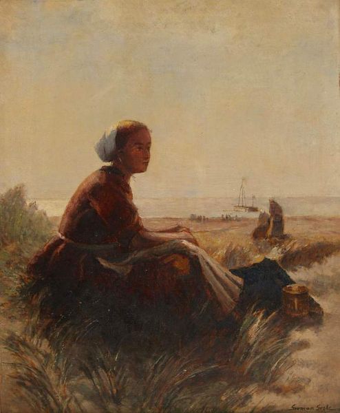 Junge Fischersfrau in Dünenlandschaft mit Fischergenre am Strand
