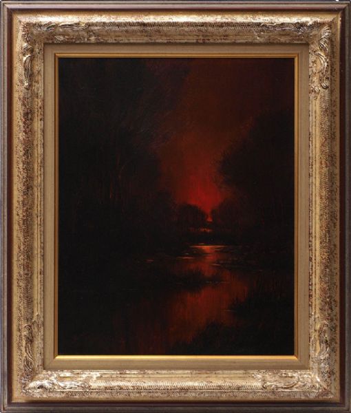 Sonnenuntergang über einem kleinen, von höhen Bäumen umstandenen See