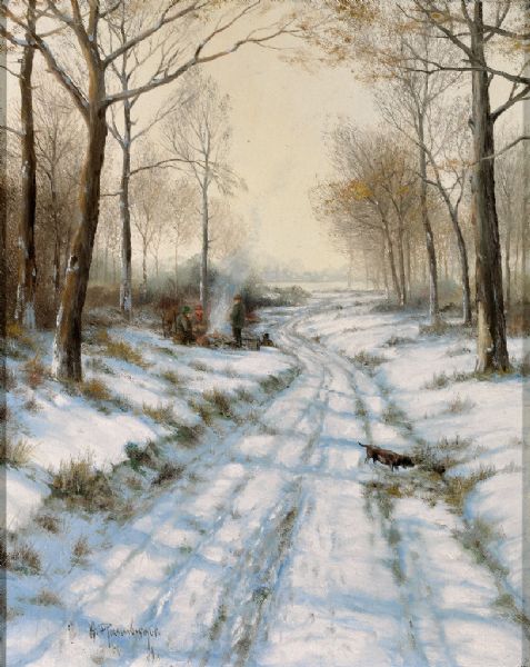| Winterlicher Weg mit schnüffelndem Jagdhund, im Hintergrund Jäger am Lagerfeuer. | |