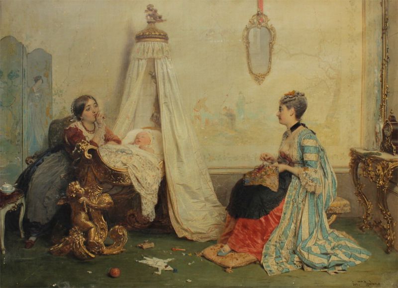 Interior Genre Scene with Two Young Women in a Nursery with Child Sleeping