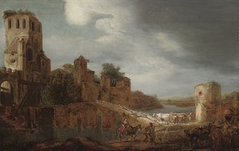 | A river landscape with a shepherd driving his flock over a bridge, a fortified town beyond | |