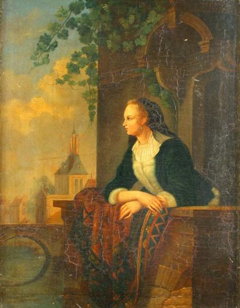 A Girl leaning on a Rug looking out of a Window in a Dutch Town