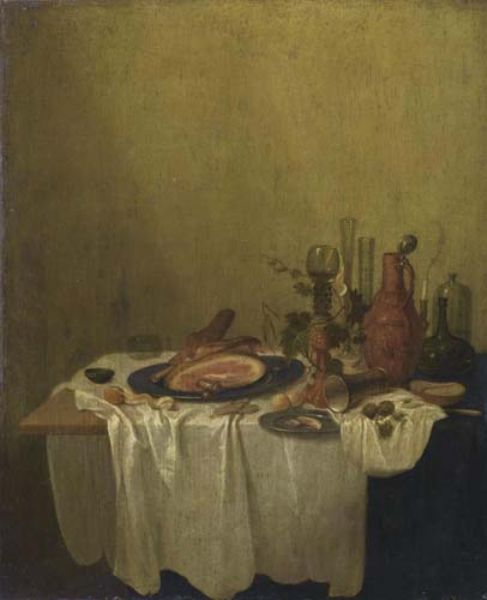 Still life with ham, glass and vessels on a table