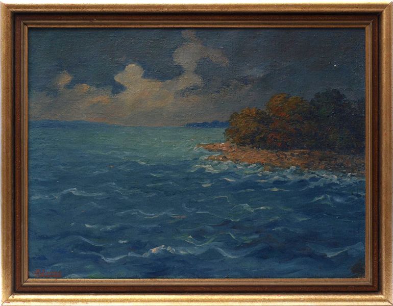Stürmischer Abend am Bodensee unter gewittrigem Himmel.