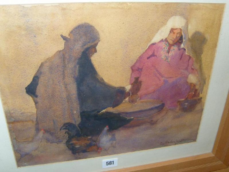 | A pair of seated Arab female figures preparing food and accompanied by poultry | |