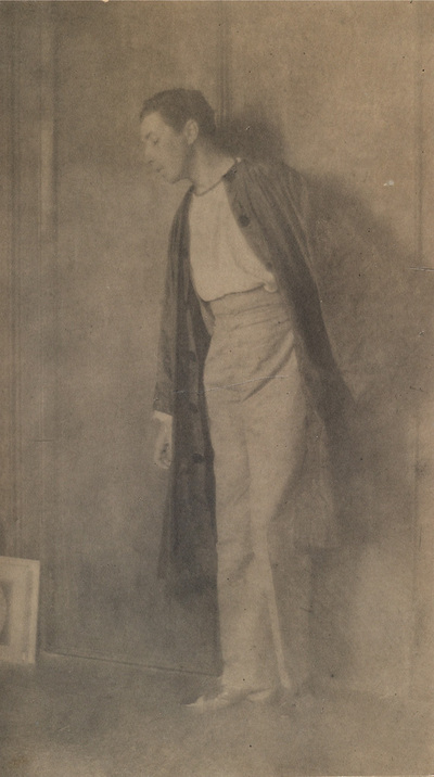 Platinum print, the image measuring 8 3/4x5 inches (22.2x12.7 cm.), double mounted, the larger with one deckled edge 9x5 3/8 inches (23x13.7 cm.), this mount with the Baron Adolph de Meyer Archive hand stamp with the number 330, in pencil, and a late | |