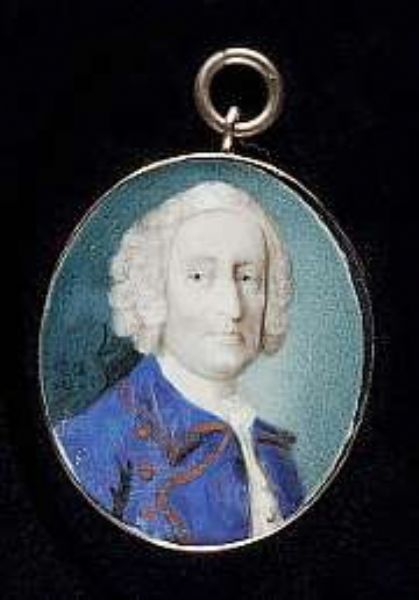 | A Gentleman, wearing gold-edge Royal blue coat, white waistcoat, frilled chemise and powdered wig worn en queue | |