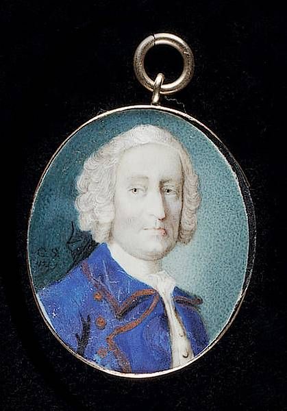 A Gentleman, wearing gold-edged Royal blue coat, white waistcoat, frilled chemise and powdered wig worn en queue.