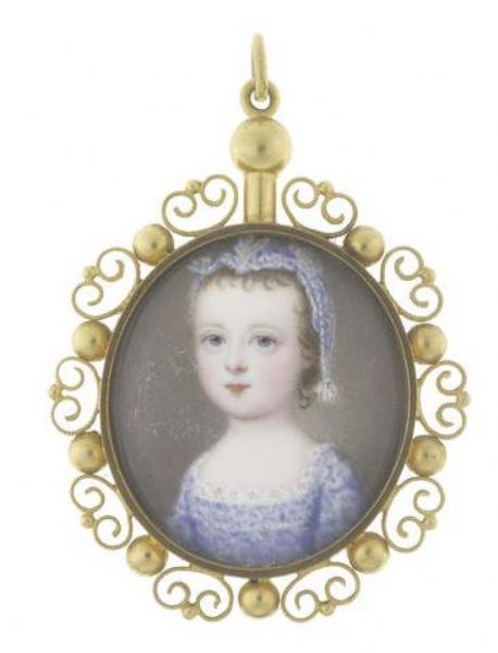 A Young Girl, wearing blue dress with white lace trim and matching cap.