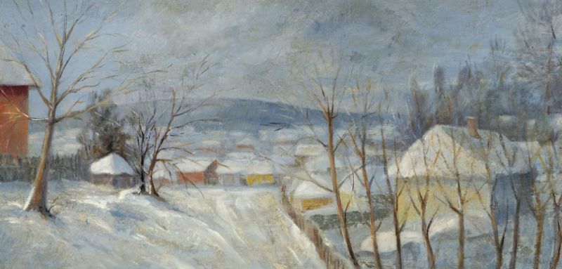 Dorp in een besneeuwd landschap
