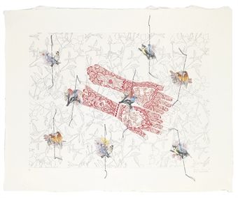 | Silkscreen etching, embroidery and printed paper collage on paper | |