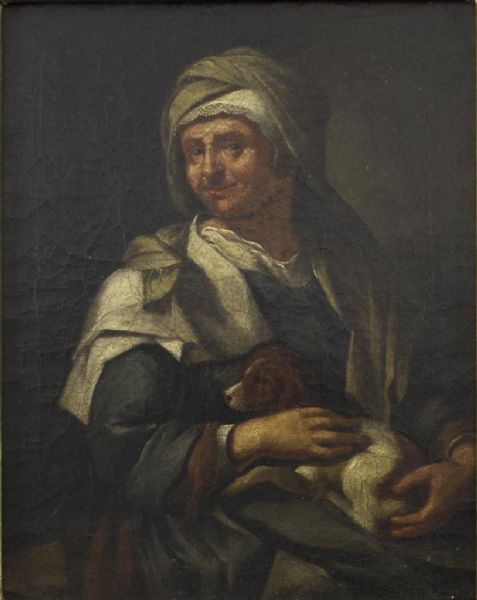 Portrait einer alten Frau mit Schoßhund.