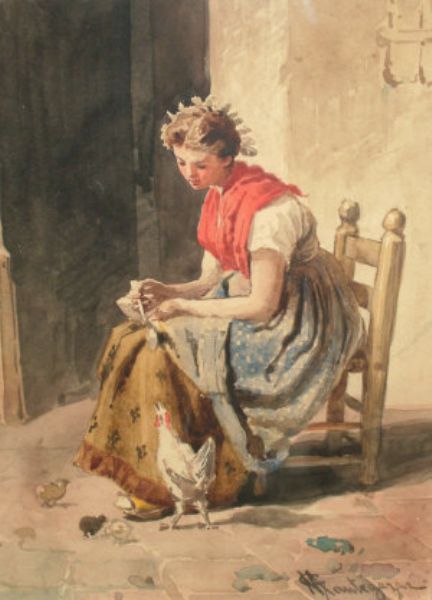Girl seated full-length feeding chickens in a court yard