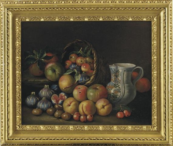 | A basket of apples and figs with hazelnuts, cherries, peaches and a porcelain jug on a ledge | |
