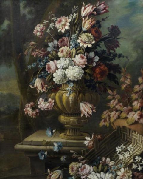 | Tulips, roses, carnations and other flowers in a bronze urn on a stone plinth, with roses, chrysanthemums and other flowers in a | |