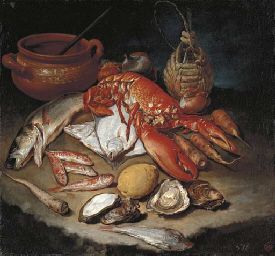 | A lobster, herring, turbot, skate, red mullets and oysters with turnips, onions, a lemon, an earthenware pot and a wicker and gl | |