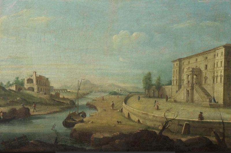 | A capriccio of a landscape in the Roman Campagna with numerous figures beside a river running between Roman ruins to the left an | |
