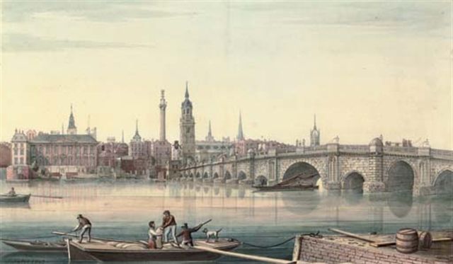 | View of Old London Bridge from the south bank looking towards Fishmongers Hall and The Monument (illustrated); and View of Old L | |