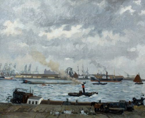 Havengezicht met Rijnaak langs de wal en sleperswagen.