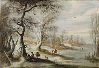 | A winter landscape with a woman and woodmen on a wooded track, a village beyond | |