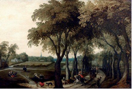 Paysage animé avec cavaliers sortant d'un château