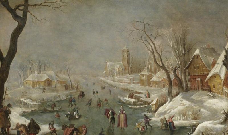 | A winter landscape with numerous figures skating on a frozen river in the midst of a village | |
